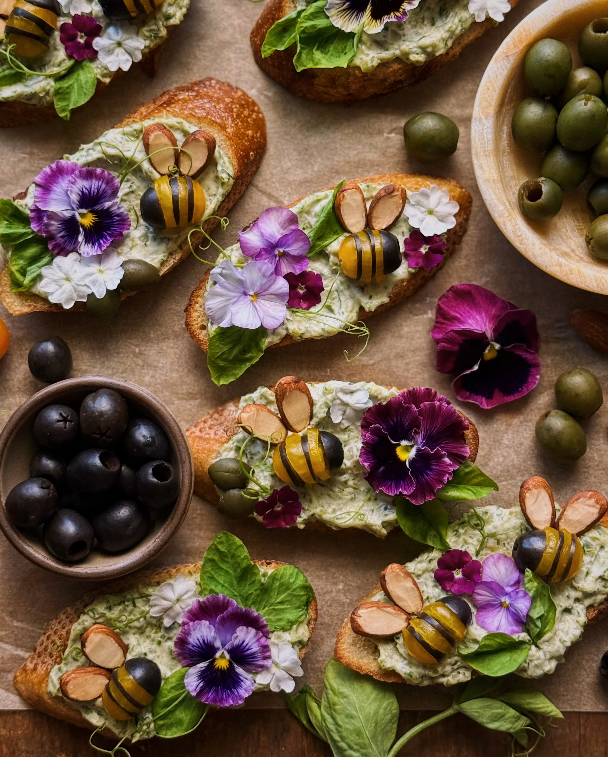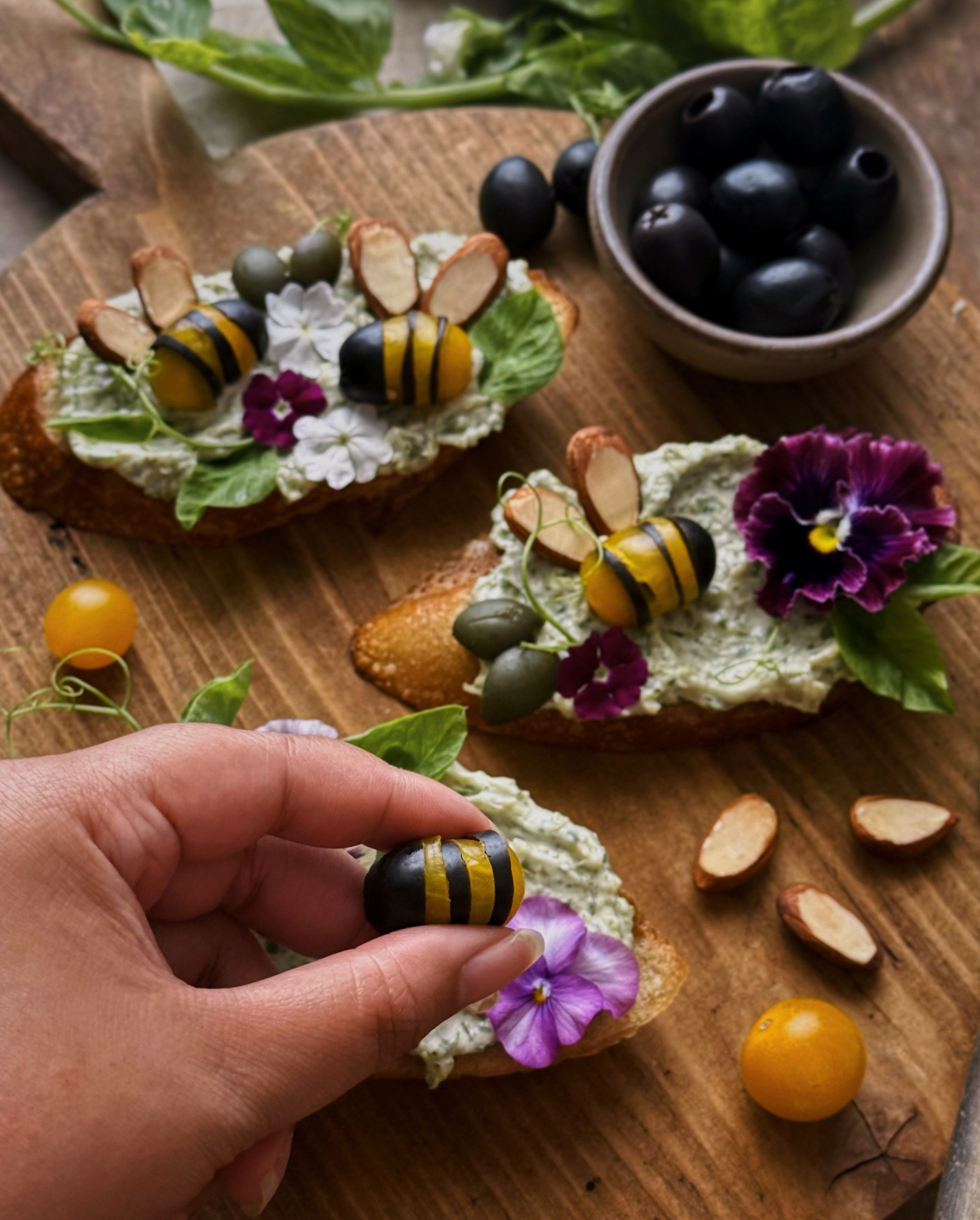 I finished decorating the crostini with the extra green olives left over from making the spread, plus some edible flowers from my garden as well as pea leaves and tendrils, to create a whole springtime scene on each crostini. These young pea greens are one of the things I look forward to at spring farmers markets. While extra decorative elements are optional, I highly encourage you to seek out this particular seasonal green. I think the pea tendrils especially add such a delicate and sophisticated touch and I love how their twists and curls mimic the movement of bees. I hope you have as much fun making these little bees and snacking on these delicious crostini as I did!