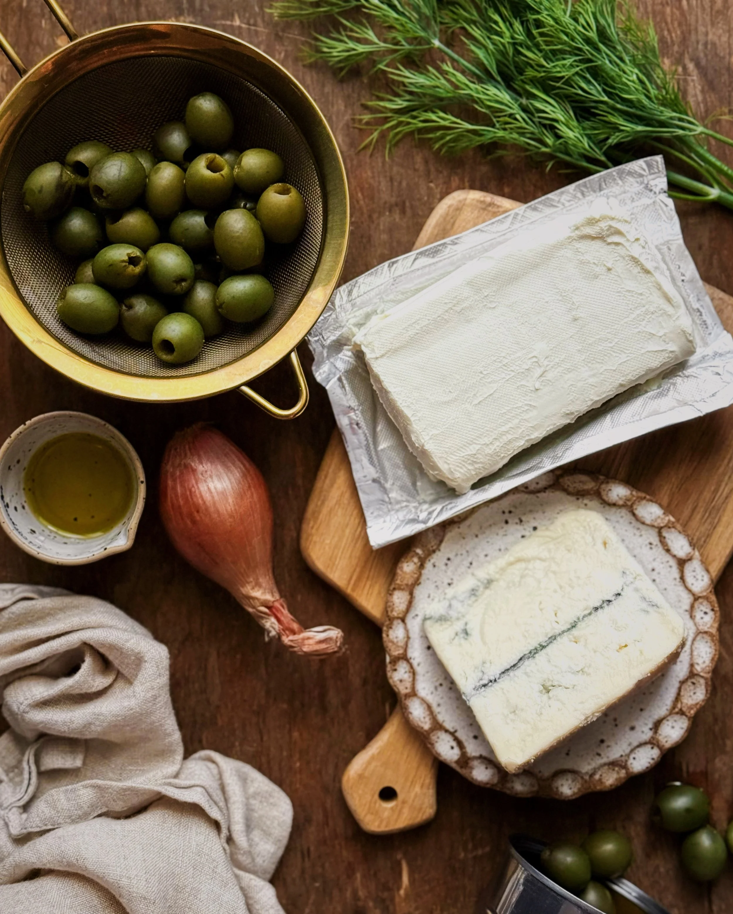 Gorgonzola Dolce: Gorgonzola is a blue-veined Italian cow’s milk cheese. “Dolce” is the milder, creamier, and subtly sweet version and that’s what we want for this recipe. We want it to blend nicely into a spread and complement the gentle flavor of the olives rather than taking over. The alternative is “gorgonzola piccante” which is more crumbly and has much more of a pungent flavor. The packaging or label usually indicates pretty clearly which type of gorgonzola you’re getting, but if it feels very soft instead of crumbly, you are likely getting the right one.