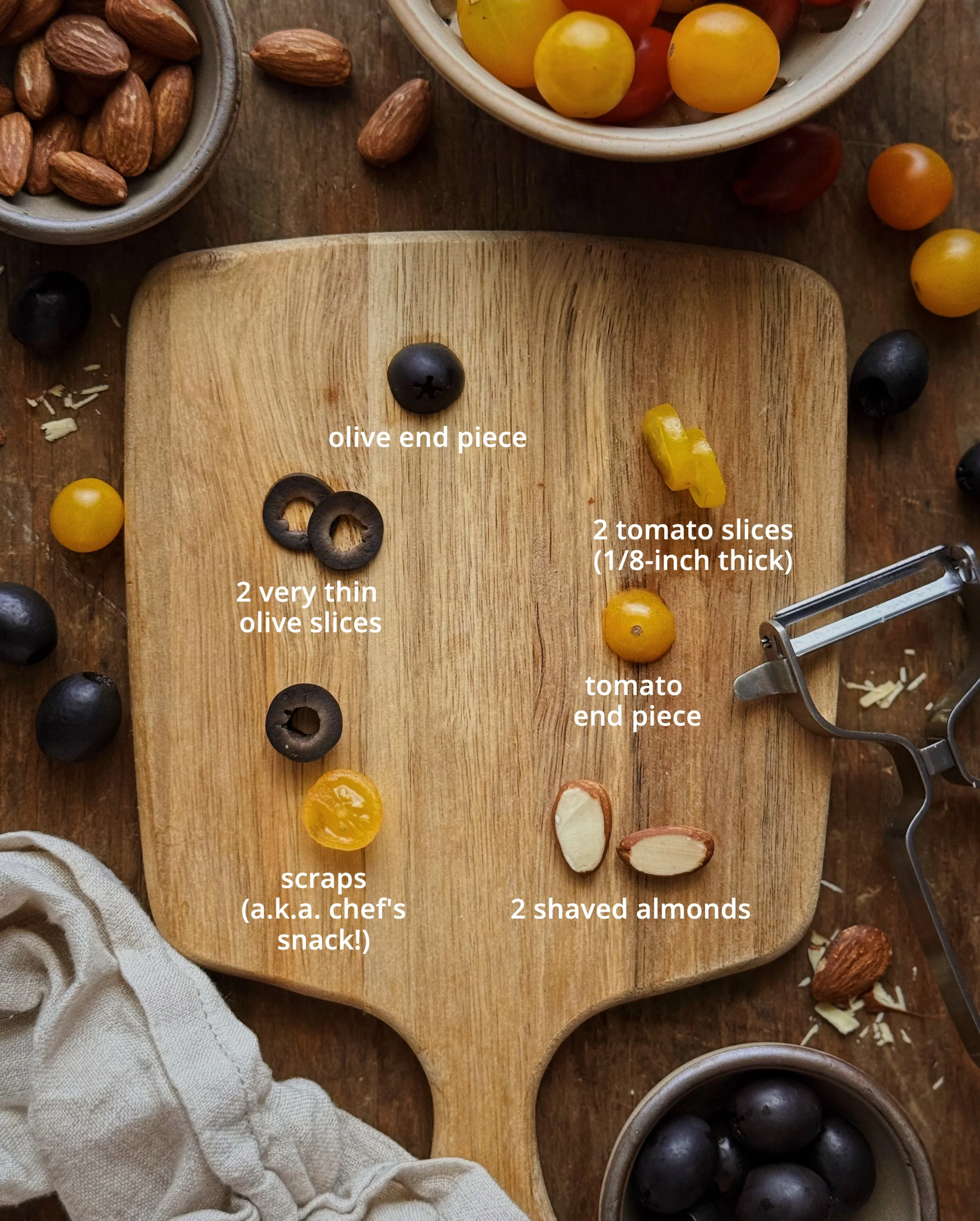 This spread is fantastic as a dip for crudités or you could use it to make a very unique tuna salad or egg salad sandwich. I also am not ashamed to admit I ate several spoonfuls of this stuff by itself throughout the process of working on this blog post. But for this recipe, I am going to use it on crostini! A thick creamy spread like this one is perfect for turning crostini into mini edible canvases that you can decorate because it acts as a delicious glue for whatever you want to add on top. And I’ll teach you how to make the cutest edible decoration to top them with, out of a few ingredients grown prominently in California—olives, tomatoes, and almonds.