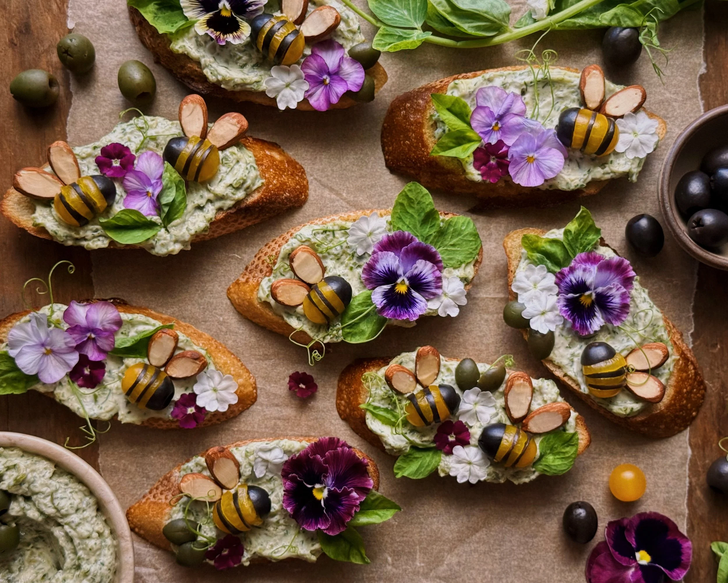 If desired, continue to decorate the crostini using pea leaves, tendrils, and edible flowers to create a whole spring scene for your little edible bees.