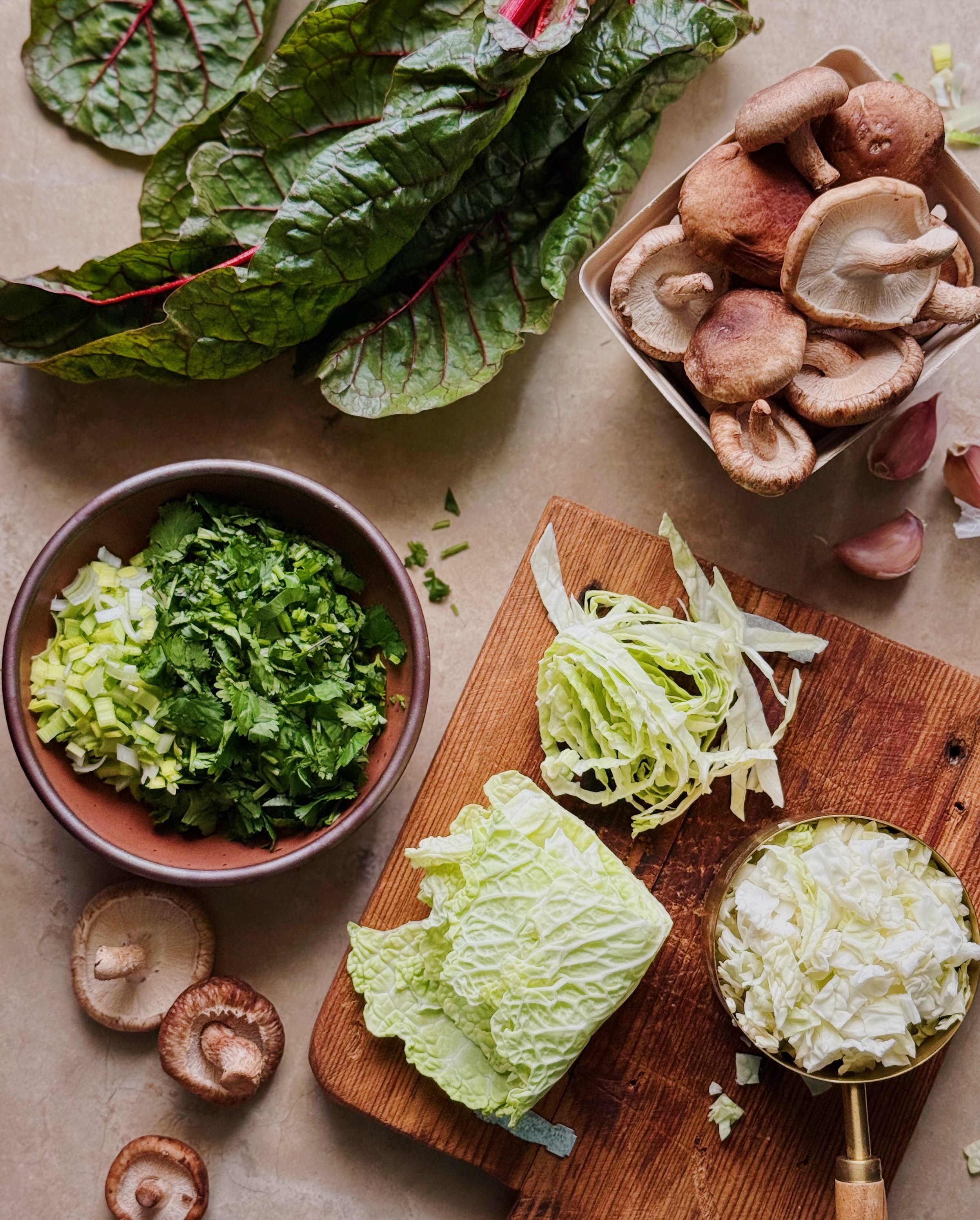 Note that when making dumplings with a predominantly vegetable filling, you will want to cook down the vegetables first. Mushrooms and leafy greens release a significant amount of water and change their form dramatically when cooked, which you want to happen before you stuff them into the wrappers. For this recipe, all the chard, cabbage, shiitakes, leeks, garlic, and cilantro get cooked and seasoned first, resulting in roughly just over 1 1/4 cups of cooked vegetables. This mixture should be cooled completely before being combined with ground pork and a bit of cornstarch to bind everything together. If you can plan ahead and cook (then refrigerate) the veggies the day before, the rest of the recipe will come together in a snap the next day!
