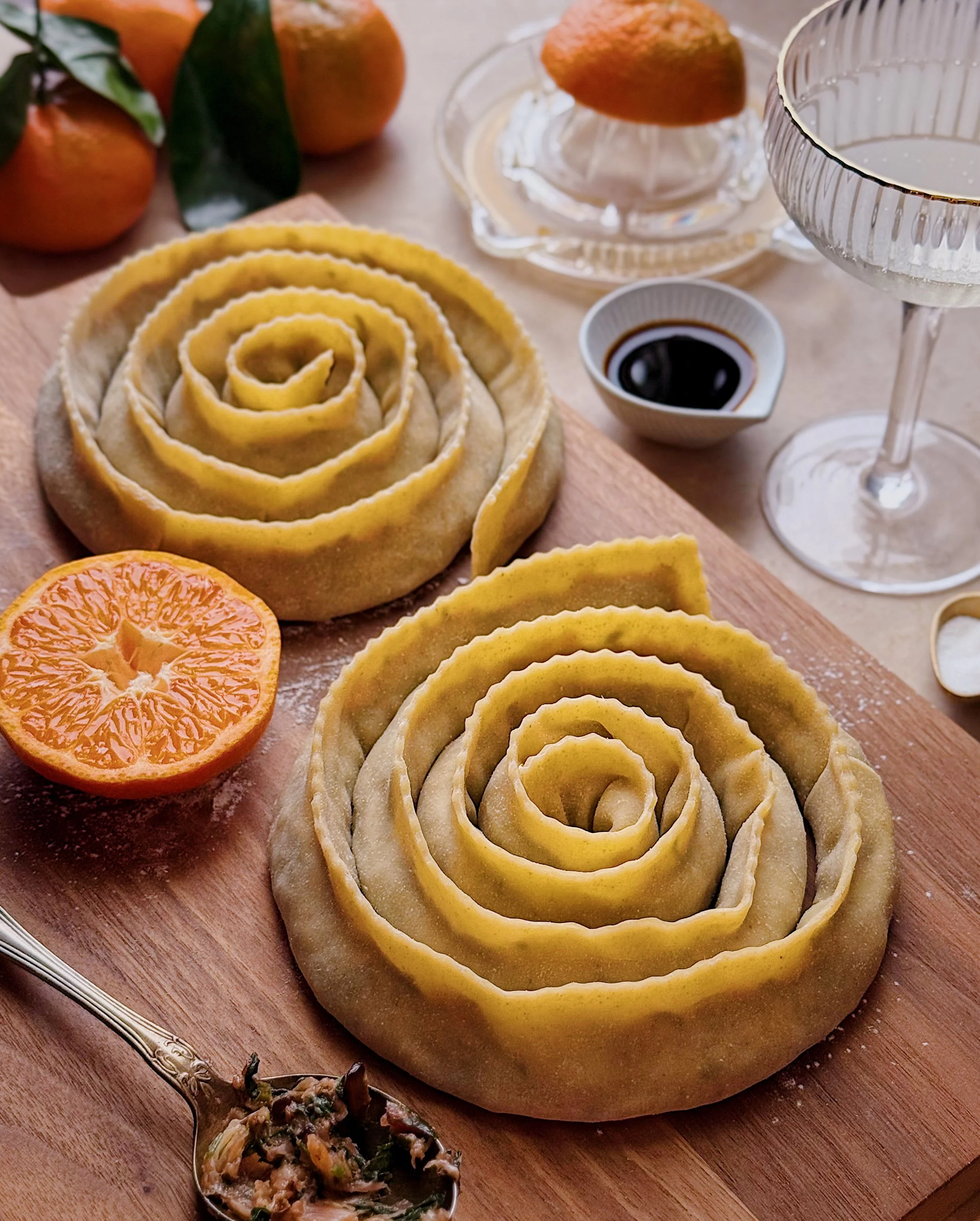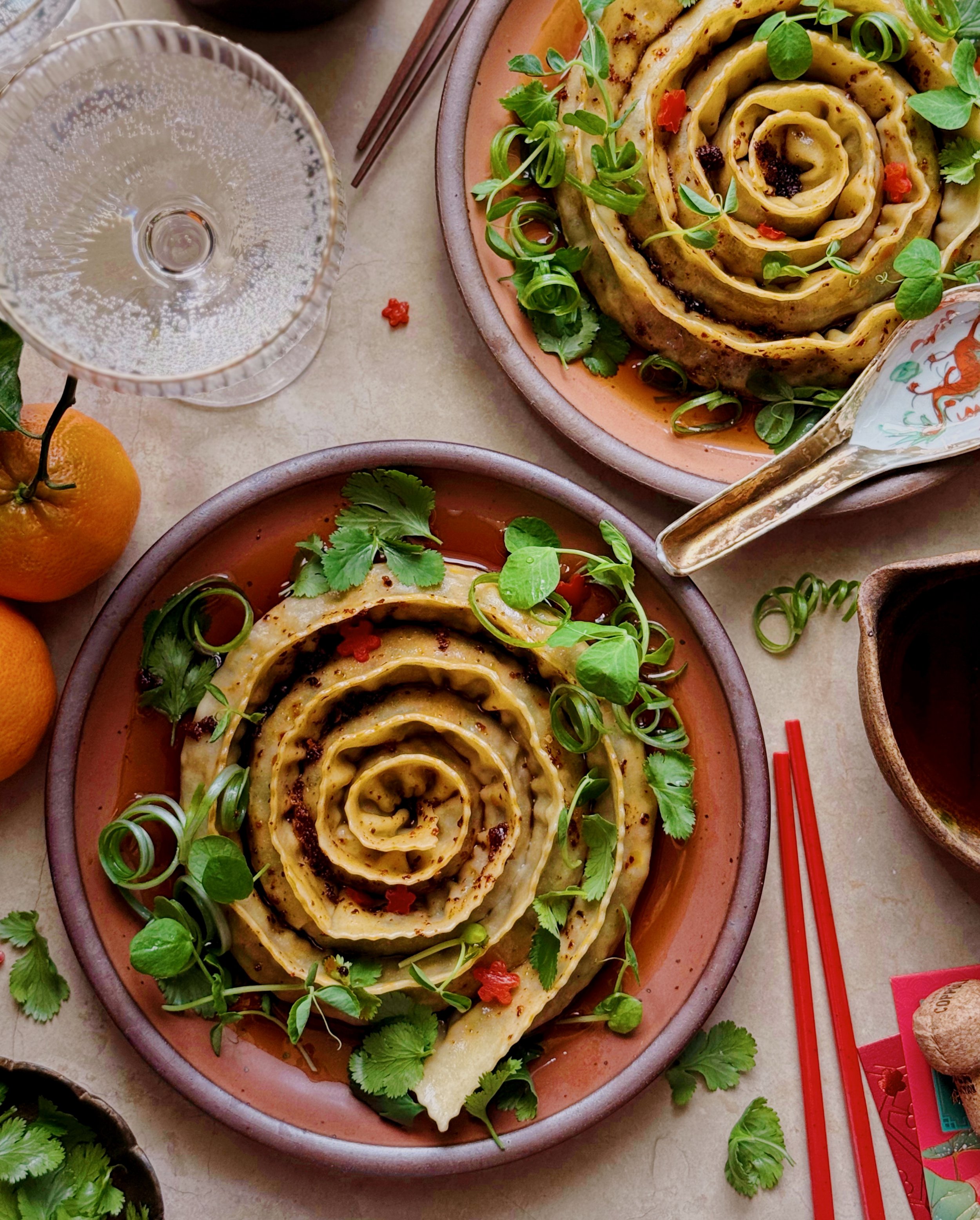 /These jumbo vegetable and pork spiral dumplings are my latest mashup idea, perfect for a low-key Lunar New Year celebration at home. An seasonal filling of leafy greens (red chard, savoy cabbage, cilantro), umami-rich shiitake mushrooms, aromatics (leeks and garlic), and pork gets tucked into long strips of thin dough to form one long stuffed noodle, coiled into a spiral then pan-fried for a satisfyingly crispy bottom. The spiral dumplings are then served in a bright, savory sauce made with soy sauce, a hint of citrus, and a surprise ingredient of California sparkling wine, whose effervescence and a gentle hint of booziness gives the dish a celebratory feel.