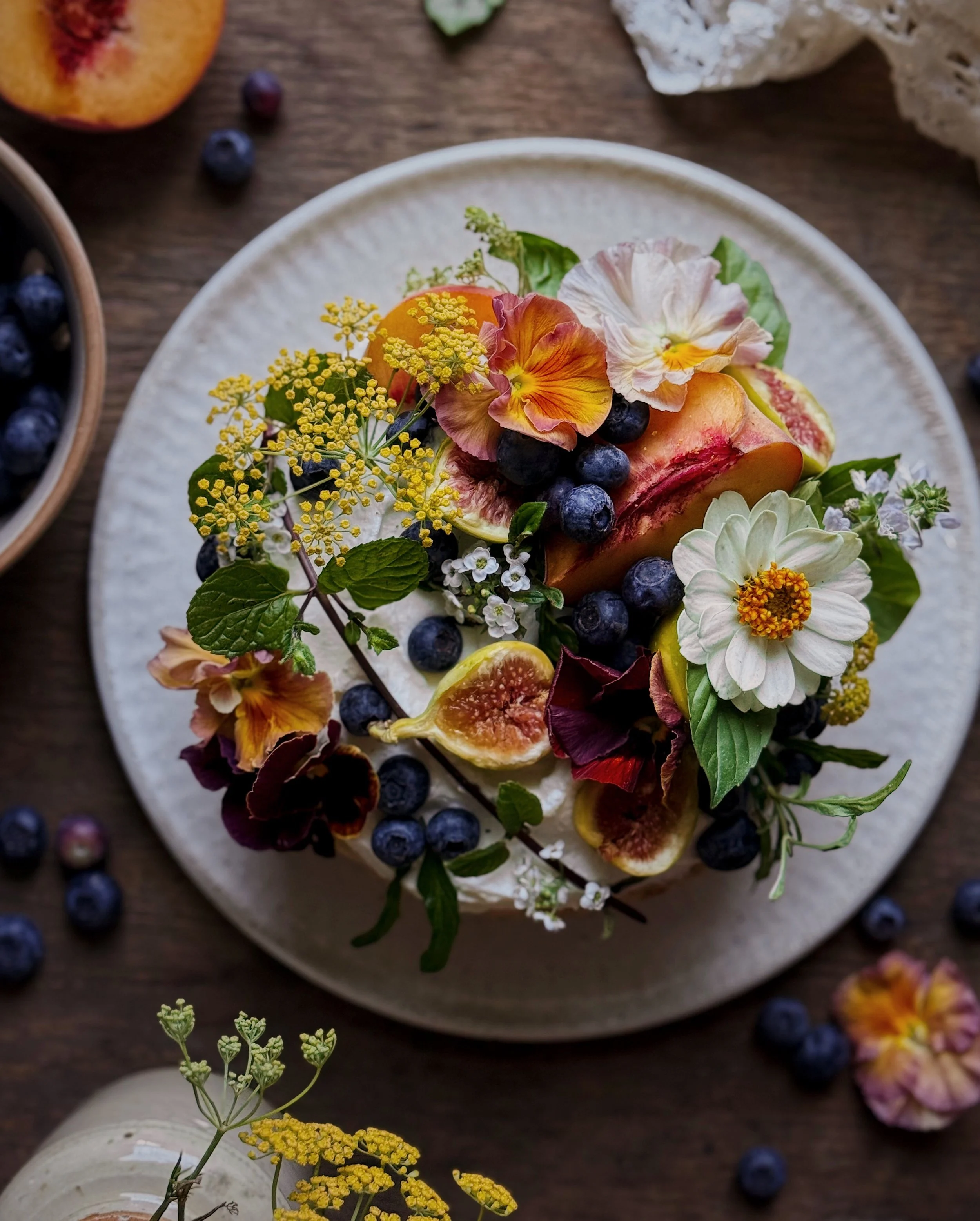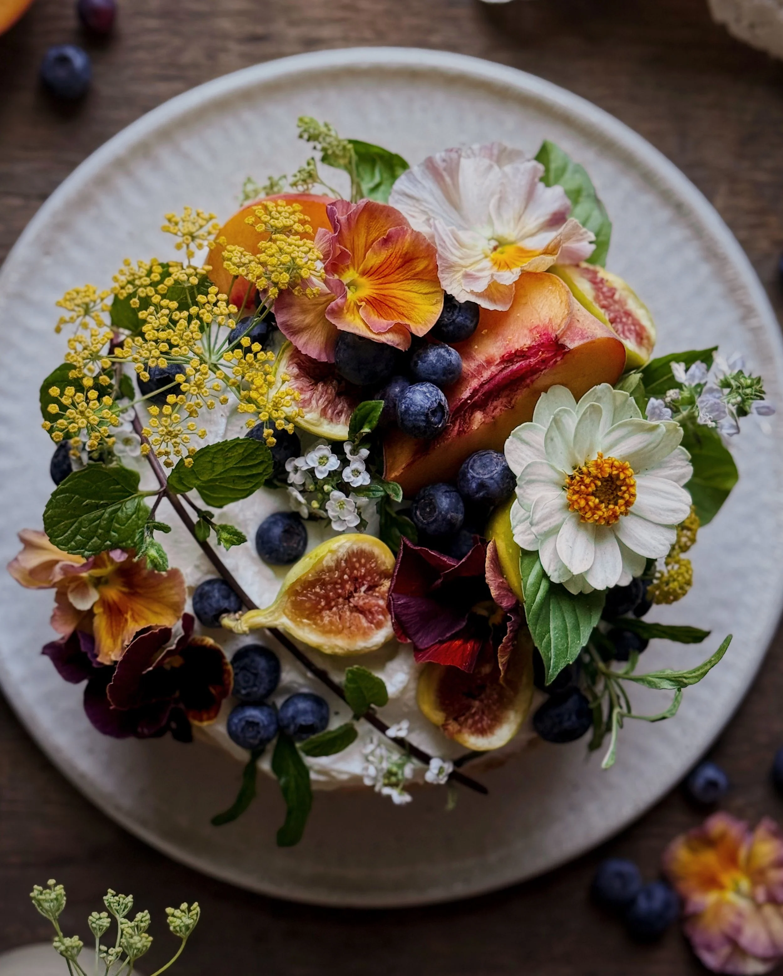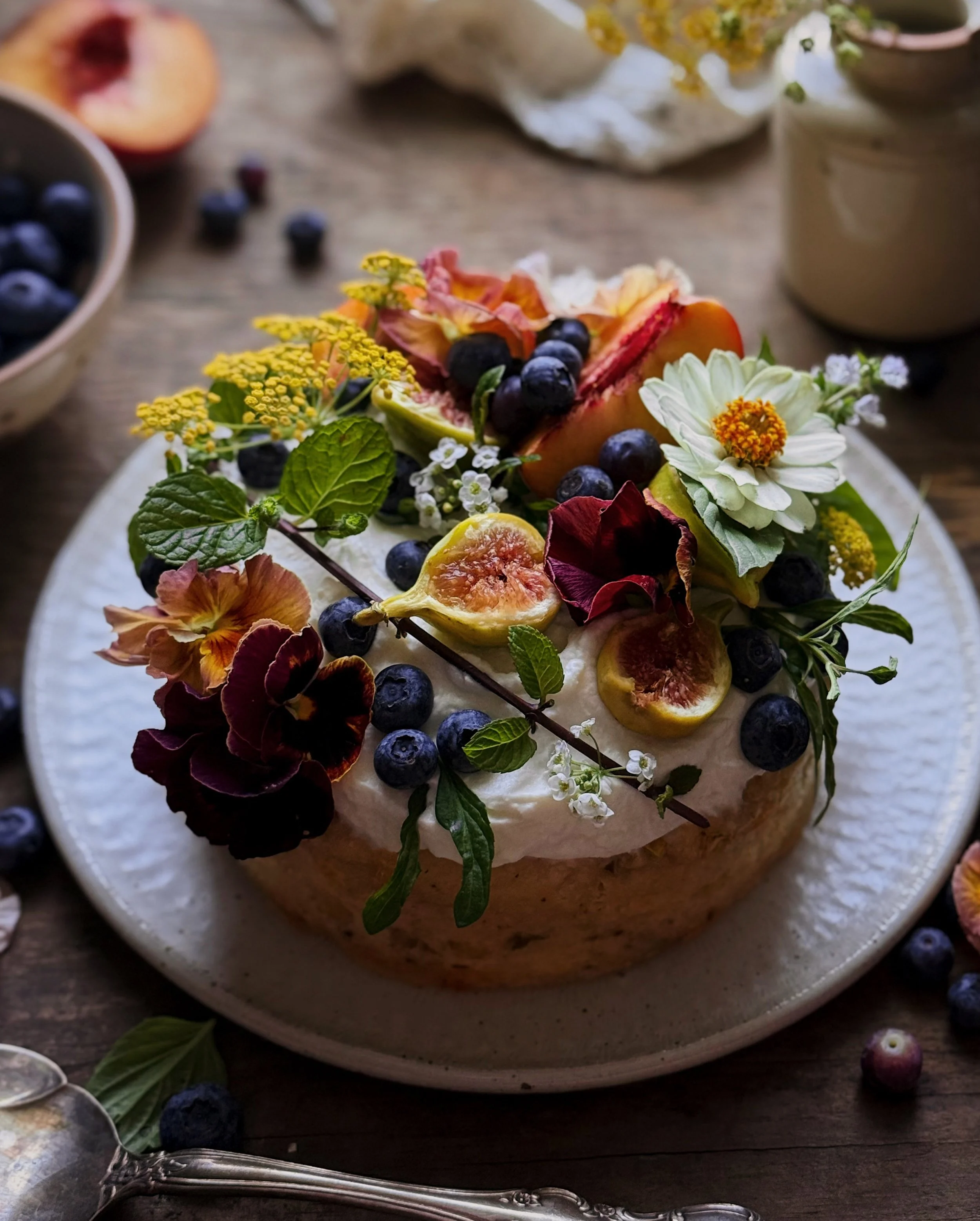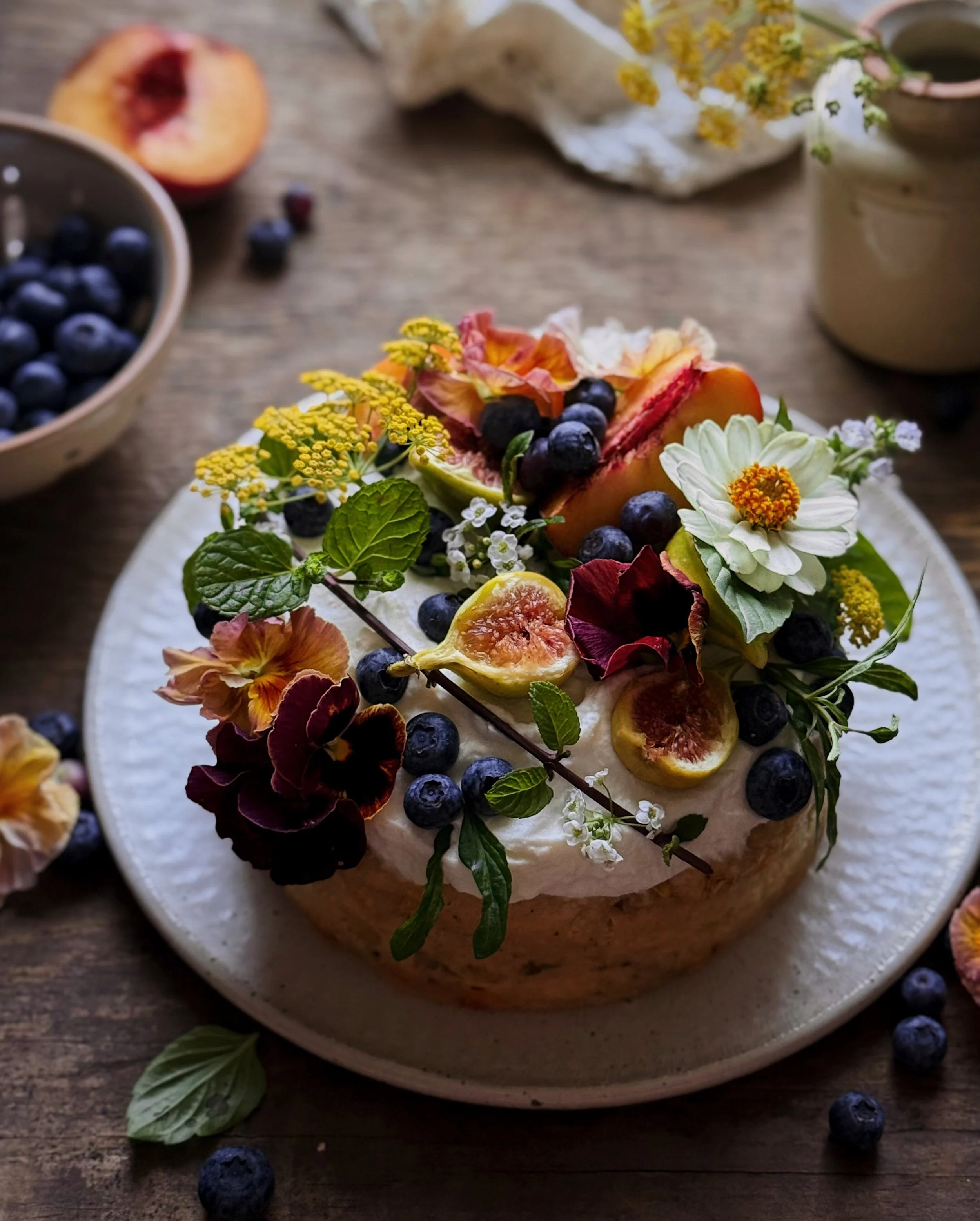 Herbs and edible flowers make for beautiful decorations for a focaccia cake. For the cake shown here in the photos, I also opted to incorporate seasonal fruits. I used peaches, figs, and blueberries. Also shown are herbs (mint and basil) and edible flowers (pansies, zinnias, fennel flowers, sweet alyssum).