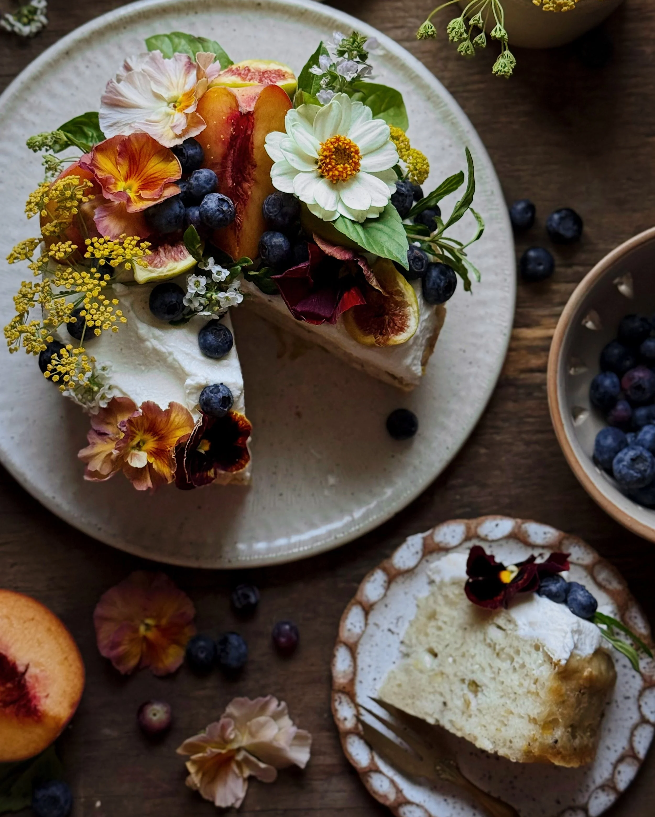 It’s my birthday cake, so I can have whatever cake I want. And in past years, I’ve made corn mochi cake, Scandinavian sandwich cakes, or just a slab of focaccia decorated it to resemble a cake with creamy cheeses as the base for the “frosting”. That last one—the focaccia styled like a cake—is something I like to make fairly often, birthday or not. I’ll just make focaccia like normal, and since it already turns out as a snack cake thickness, I treat it like a savory snack cake. I’ll “frost” it with whipped feta or ricotta on top, and then make it look pretty with herbs and edible flowers.